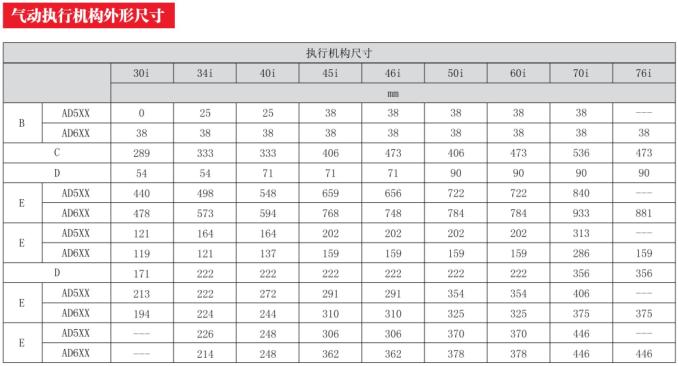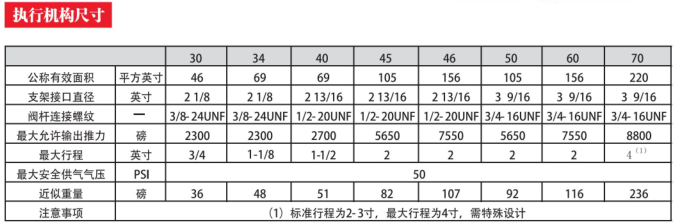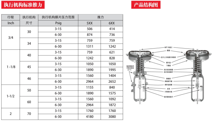 2、采用弹簧平衡的AD5XX和AD6XX型尺寸30-70膜片式执行机构通过作用到执行机构膜片的控制器或阀门定位器气动输出信号来定位阀门中的阀芯。AD5XX型执行机构是正作用执行机构,AD6XX型执行机构是反作用执行机构,这两种执行机构能够使控制阀进行可靠的开关或节流控制。